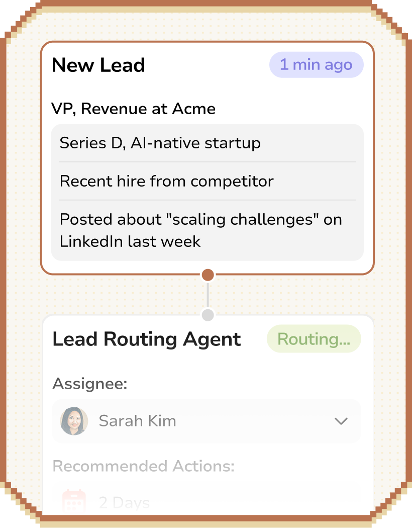 In practice, this means your best instincts and knowledge get baked into the system - through prompts, scoring logic, and decision rules - so the AI operates with your perspective, not generic automation. AI might research a prospect's company and draft personalized talking points based on criteria you've defined. But a human reviews and sends the actual message. AI might score and route inbound leads using patterns you've identified, but a human decides which ones to prioritize.